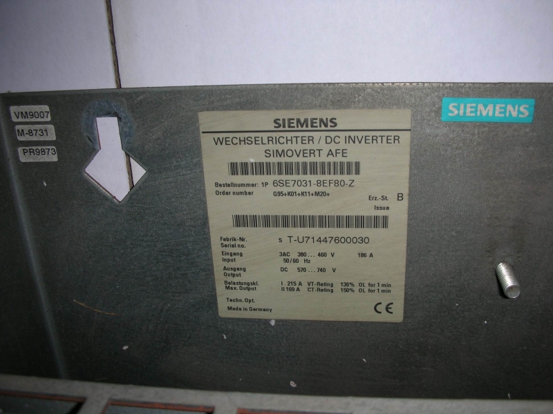 6SE70318EF80 Manufactured by SIEMENS SIMOVERT MD MC 460V AC, 90KW, 3PH,168A Weight: 143 lbs